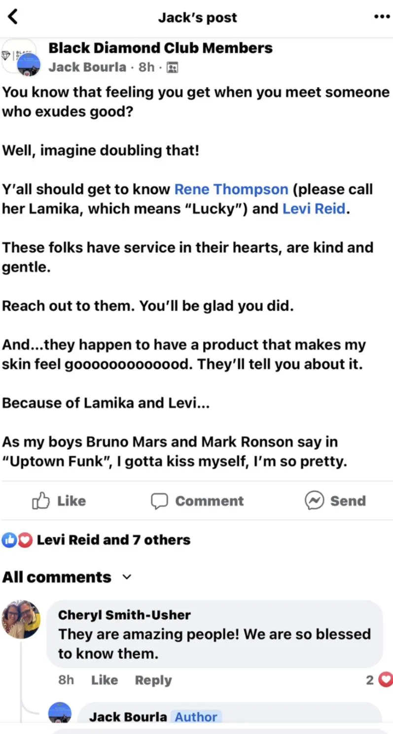 “Levi & Lamika Rene taught me different strategies and tips on how to improve our sales as network marketers. They really know their stuff, encourage-able, supportive and they are always there to answer any of your questions. Thank you for your Leadership?"