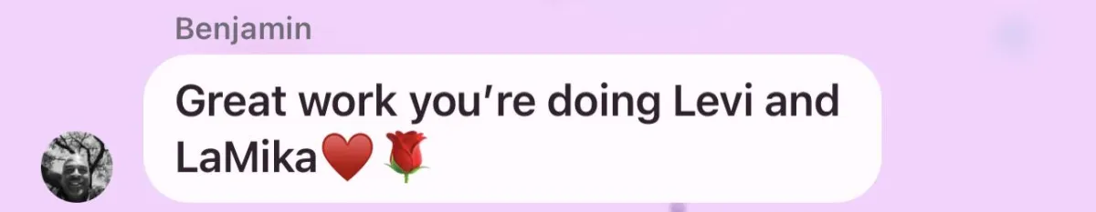 “Great journey great work you're doing Levi and Lamika I am so so proud of you all, thank you for sharing that with us it is vital to our learning experience...”